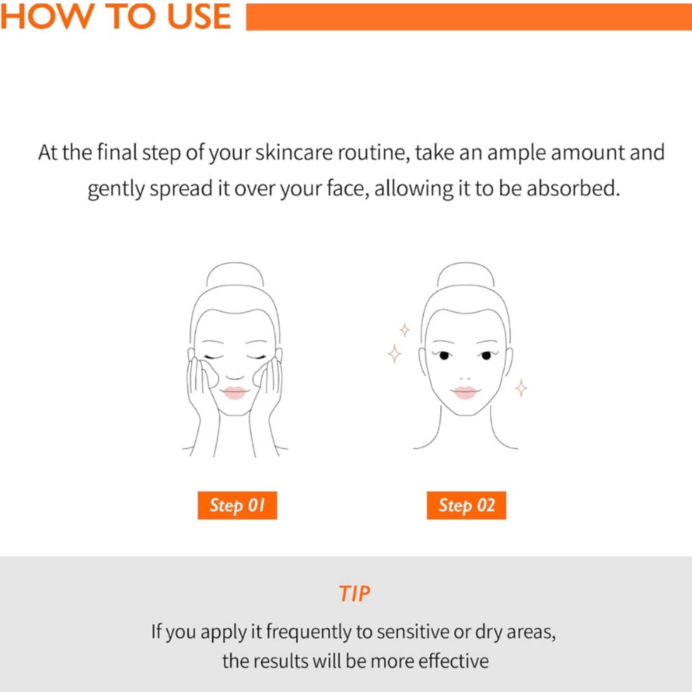 After cleansing and toning, apply a moderate amount evenly to the face. Gently pat to enhance absorption.